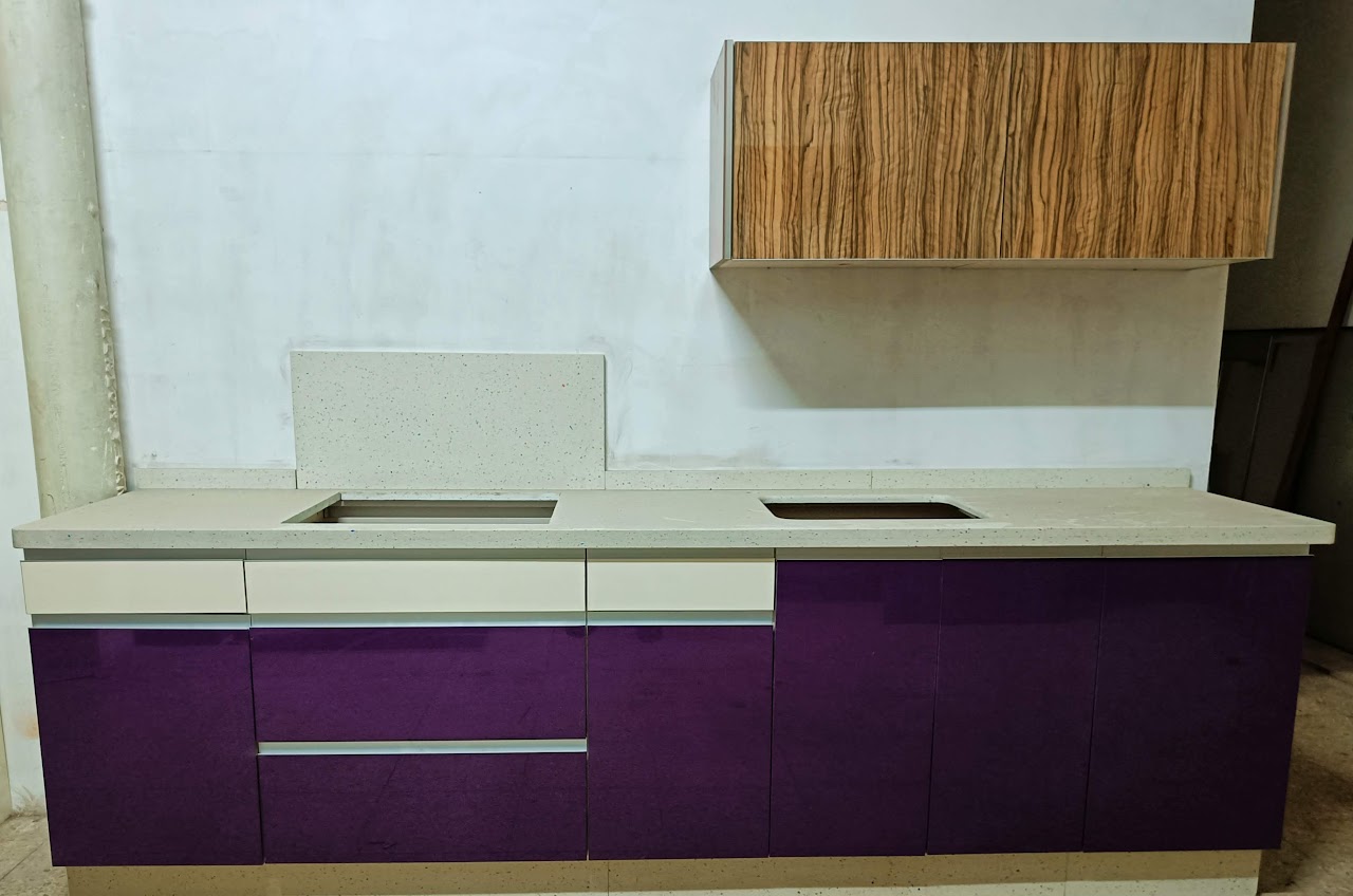 Cocina lineal en Alto brillo, de exposición, combinación de colores con los módulos: 1 Puerta y cajón de 45. 1 Cajón y 2 Caceroleros con freno de 70. 1 Puerta y cajón de 40. 1 Bajo Fregadero de 70. 1 Puerta de 45. Silestone