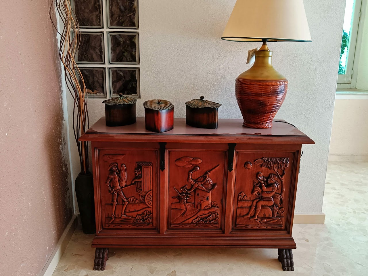 Baúl de madera con motivos Quijotescos, representando varias escenas del libro de Don Quijote de la Mancha.