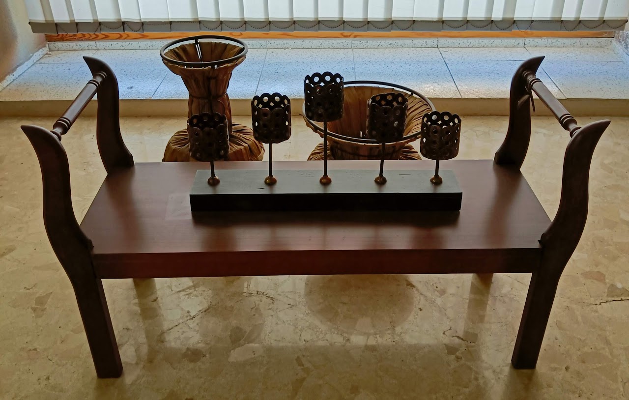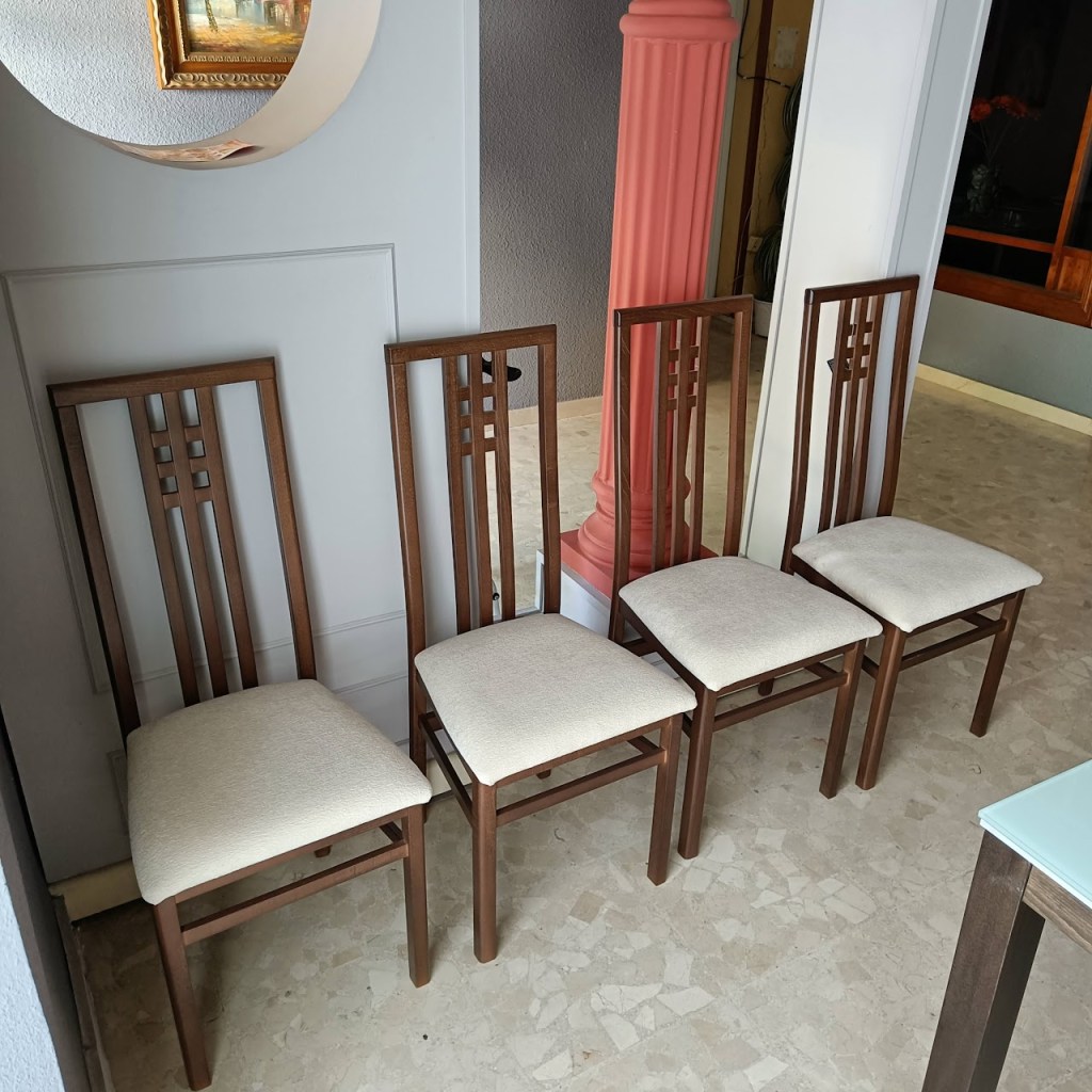 Salón completo de madera, compuesto de mueble, mesa y sillas en tono roble medio.