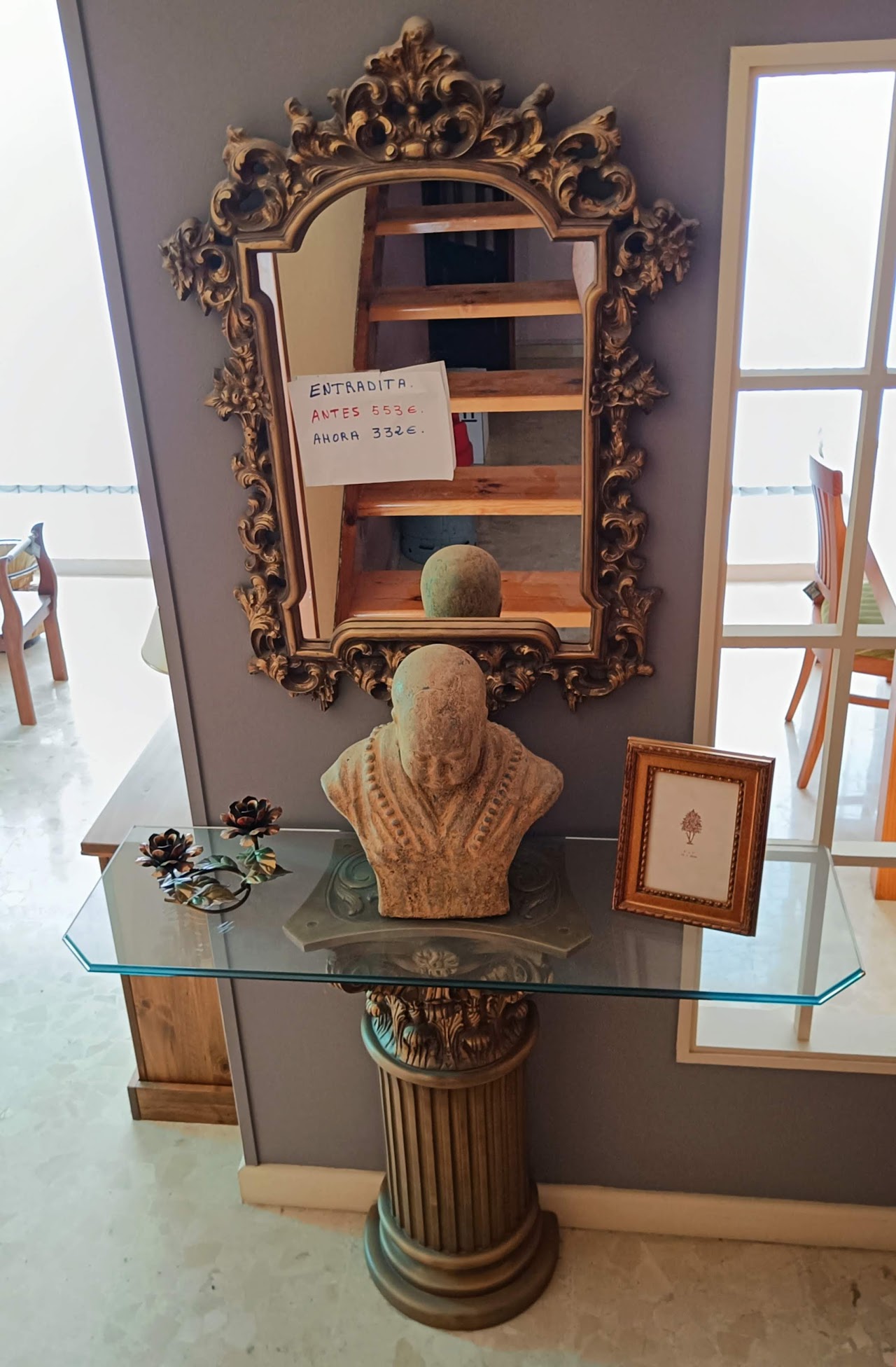 Entradita con espejo labrado y tono en oro, cristal y pie romano a juego.