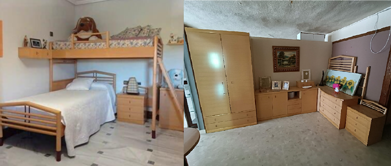 Dormitorio compuesto por literas de 90×180 y 90×200 con colchón y somier, mesita armario, estanterías, 5 modulares y 1 módulo de colgar.